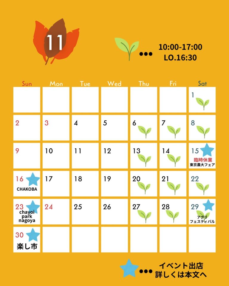 2025/11/04 11月の営業日 お知らせ いつもかぶせ茶カフェをご利用いただき ありがとうございます。 2025年11月の営業日です。 15日(土)は臨時休業させていただきます。 11月後半は紅葉もお楽しみいただけそうです! ぜひ水沢へお越しくださいませ。
